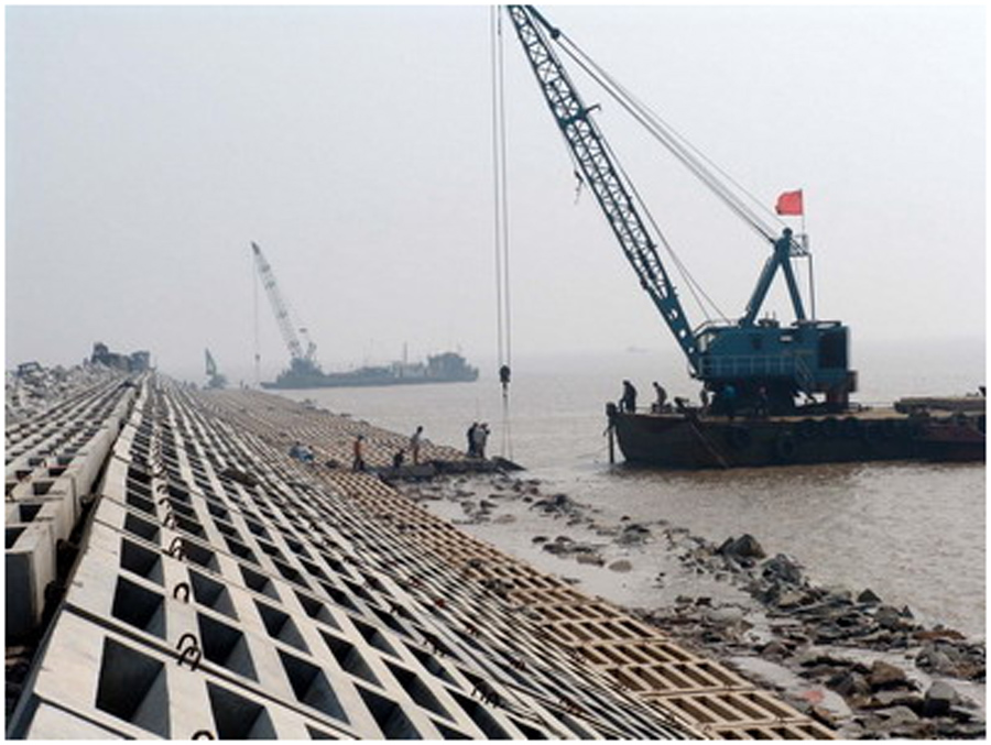 Introduction: The bank revetment project is divided into the internal bank revetment engineering and external bank revetment engineering. The section with riprap sloping dike structure is adopted for the external bank revetment, and the length of the bank revetment of the section is 1458.815m. The length of the internal bank revetment is 902.357m. The foundation treatment area is 61457m2, and the backfill soil is 86040m3.