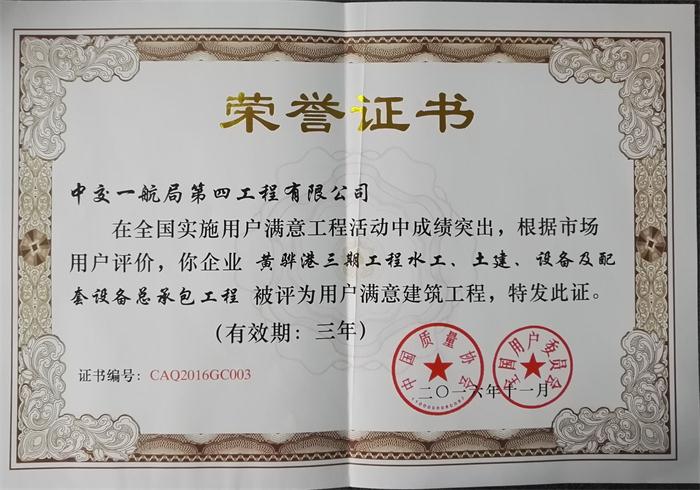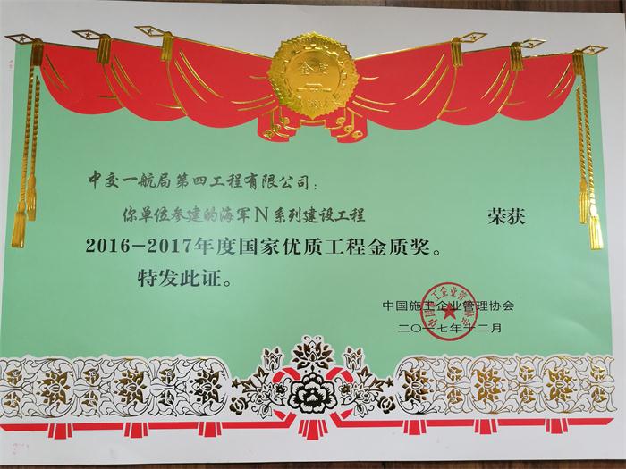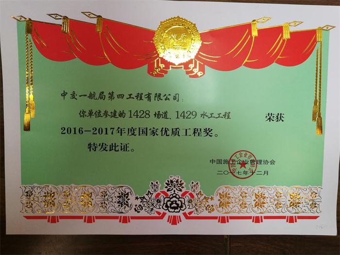 1428场道、1429水工工程荣获2016-2017年度国家优质工程奖奖状