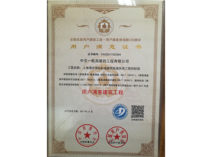 上海浦东国际机场第四跑道系统工程四标段荣获2017年度“用户满意建筑工程”1