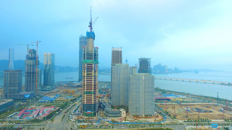 中交汇通横琴广场工程是中国交建首个超高层高端城市综合体开发项目,集5A甲级办公、总部式办公、餐饮、展示、住宅等功能为一体。地上部分由2栋公寓楼住宅、1栋办公塔楼及3栋商业裙房组成。本次验收的2栋公寓楼结构形式均为剪力墙结构,其中,1号公寓楼37层,结构高度119.7米;2号住宅楼30层,结构高度97.65米。