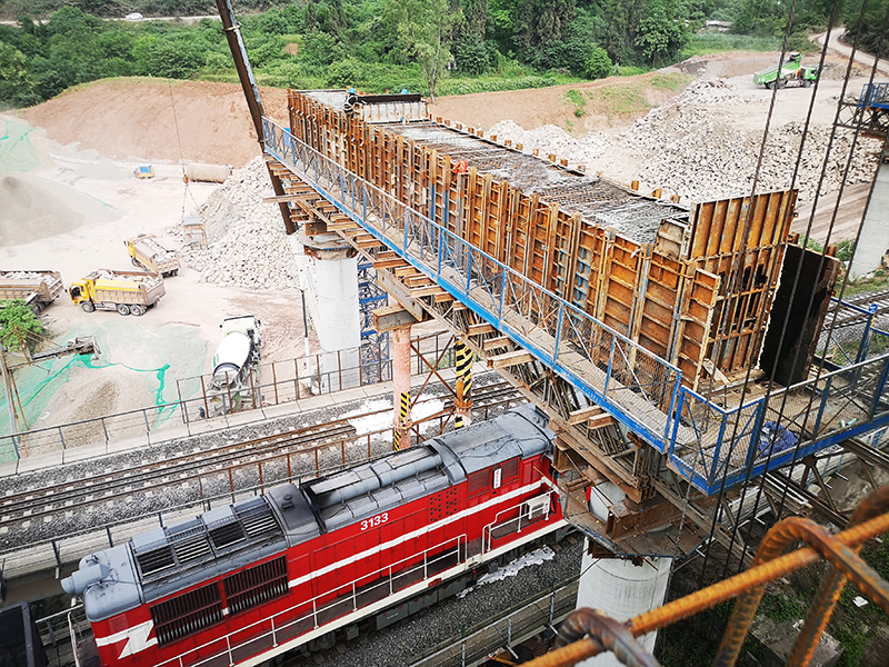 铁路跨线桥左幅21号盖梁跨度21.3米,为项目全线跨度最大的盖梁,盖梁施工上跨铁路。施工中,项目积极开展对外协调,动态调整施工,组织专项安全教育与交底,加强现场盯控,严把安全质量关,克服跨铁路施工协调难度大、安全风险高及施工时间短等不利因素,确保施工建设安全平稳可控。