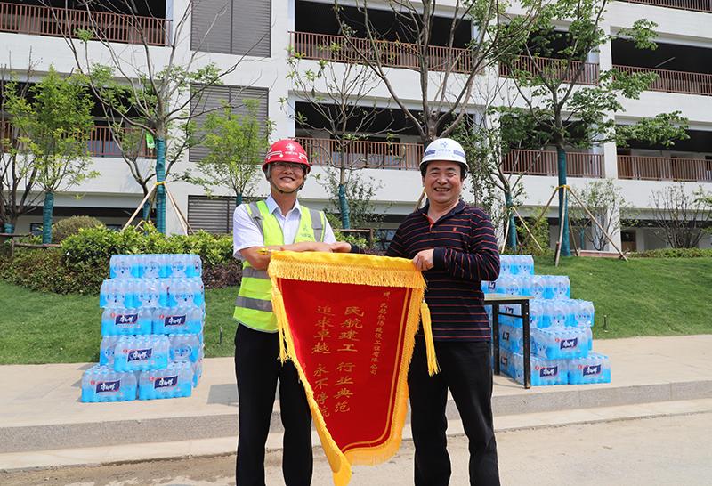 近日,华东师范大学盐城实验中学校长到18luck新利登陆地五总经理部、第七总经理部承建的华东师范大学盐城实验中学项目进行慰问,并赠送印有“民航建工 行业典范 追求卓越永不停航”字样的鲜红锦旗,对工程的高效推进表示满意,并为项目一线建设者送来防暑降温饮品。