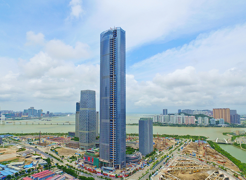 此次获奖的中交汇通横琴广场项目3号主塔楼建筑高度为309.4米,结构形式为钢管混凝土框架+钢筋砼核心筒+伸臂桁架结构体系,其中外框由12根钢管混凝土柱作为竖向支撑构件;核心筒地下-4至8层、20至22层、41至43层为钢板剪力墙结构;21层、42层为伸臂桁架抗侧力体系,整体钢构重量约3万吨,其中单体最重钢构构件重量为49.8吨。