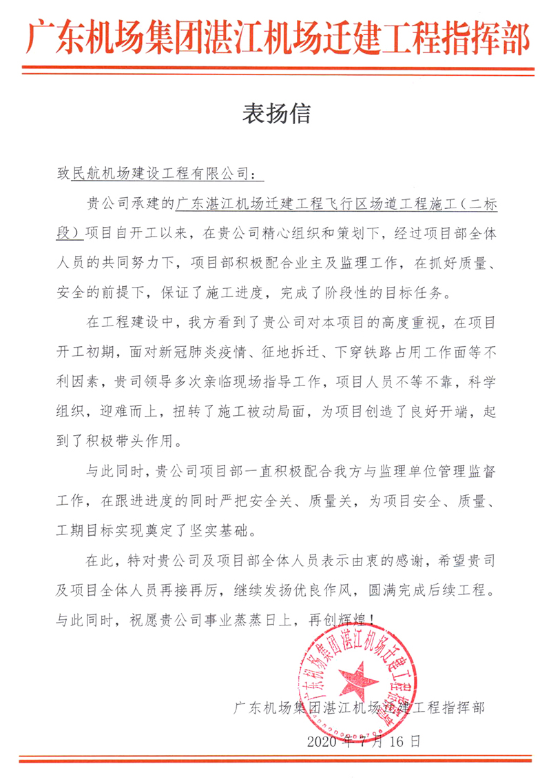 7月16日,第十六总经理部承建的广东湛江机场迁建工程飞行区场道工程施工(二标段)项目,收到来自广东机场集团湛江机场迁建工程指挥部发来的表扬信。