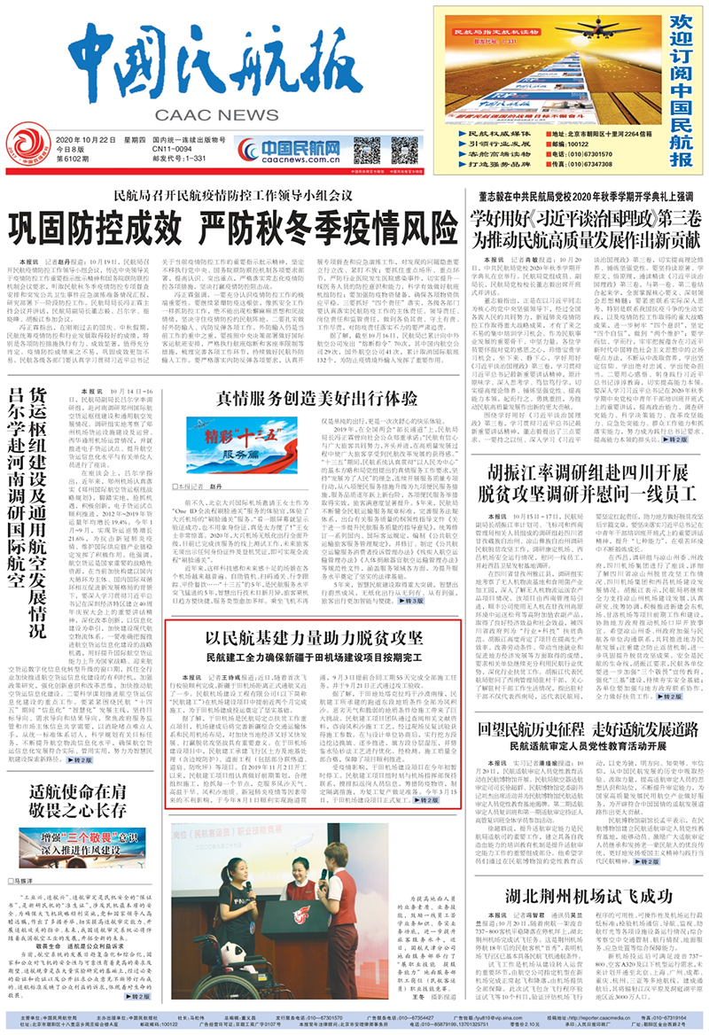 近日,《中国民航报》第6102期1版,以《以民航基建力量助力脱贫攻坚——民航建工全力确保新疆于田机场建设项目按期完工》为题,对18luck新利登陆第九总经理部承建的新疆于田民用机场项目建设情况进行了专题报道。