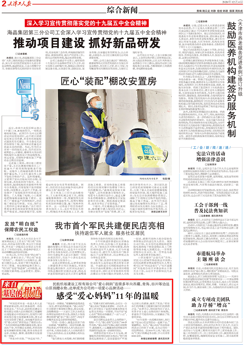 12月4日,《天津工人报》第10464期2版“来自基层的报道”栏目,以《感受“爱心妈妈”11年的温暖》为题,报道了“民航建工妈妈群”连续11年向四川、西藏、青海等高寒地区募捐御寒衣物活动的感人事迹。