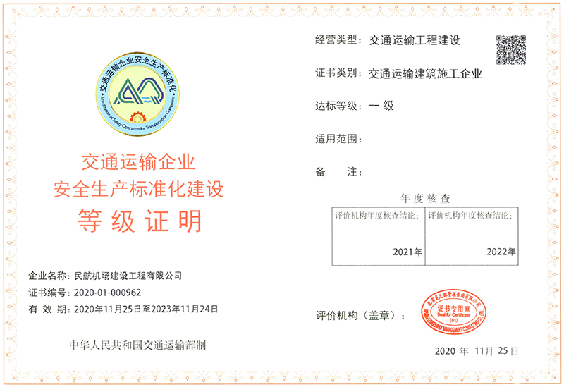 日前,经交通运输企业安全生产标准化管理系统相关公示,18luck新利登陆顺利通过交通运输建筑施工企业安全生产标准化建设一级达标复评审核。