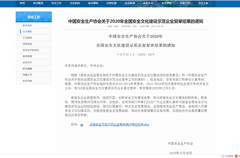 “全国安全文化建设示范企业”是国家应急管理部为鼓励企业加强安全管理,创新安全文化建设成果,探索安全文化建设的新机制、新途径,进一步强化企业安全生产基础工作,不断提升安全管理水平,更好地发挥示范带头作用而委托中国安全生产协会授予企业的荣誉,有效期三年。