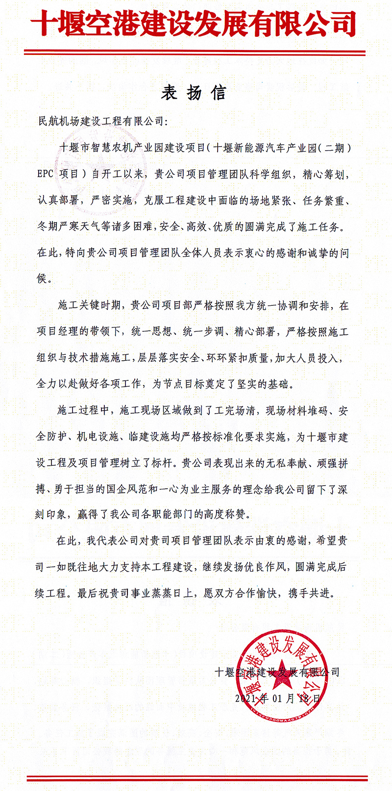 1月18日,第二总经理部承建的十堰市智慧农机产业园建设项目受到业主单位十堰空港建设发展有限18luck新利登陆致信表扬。