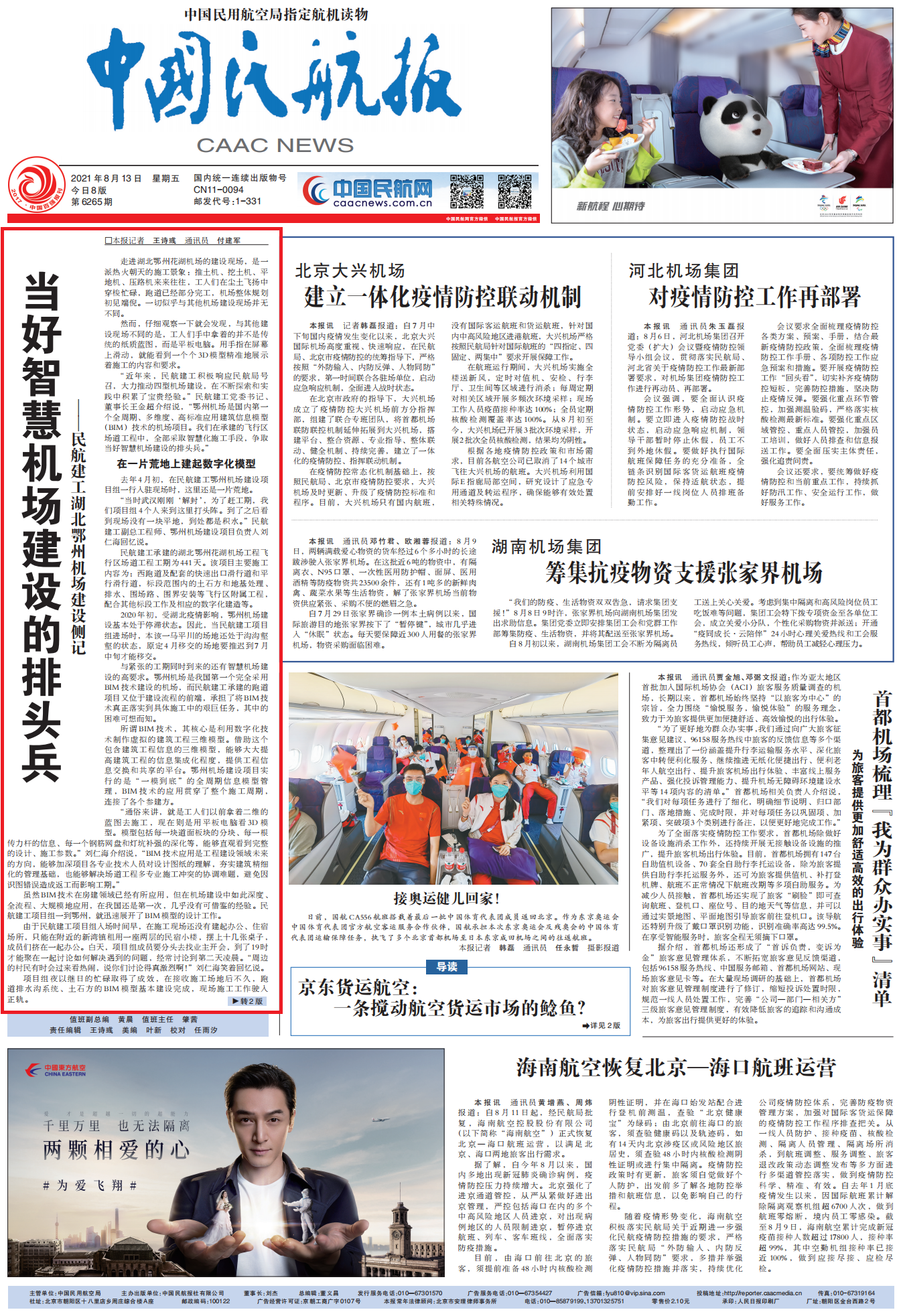 8月13日,《中国民航报》第6265期刊发头版头条文章,以《当好智慧机场建设的排头兵——民航建工湖北鄂州机场建设侧记》为题,对18luck新利登陆第十一总经理部承建的湖北鄂州花湖机场飞行区场道工程一标段数字化施工与BIM应用及项目整体建设情况等进行了专题深度报道。
